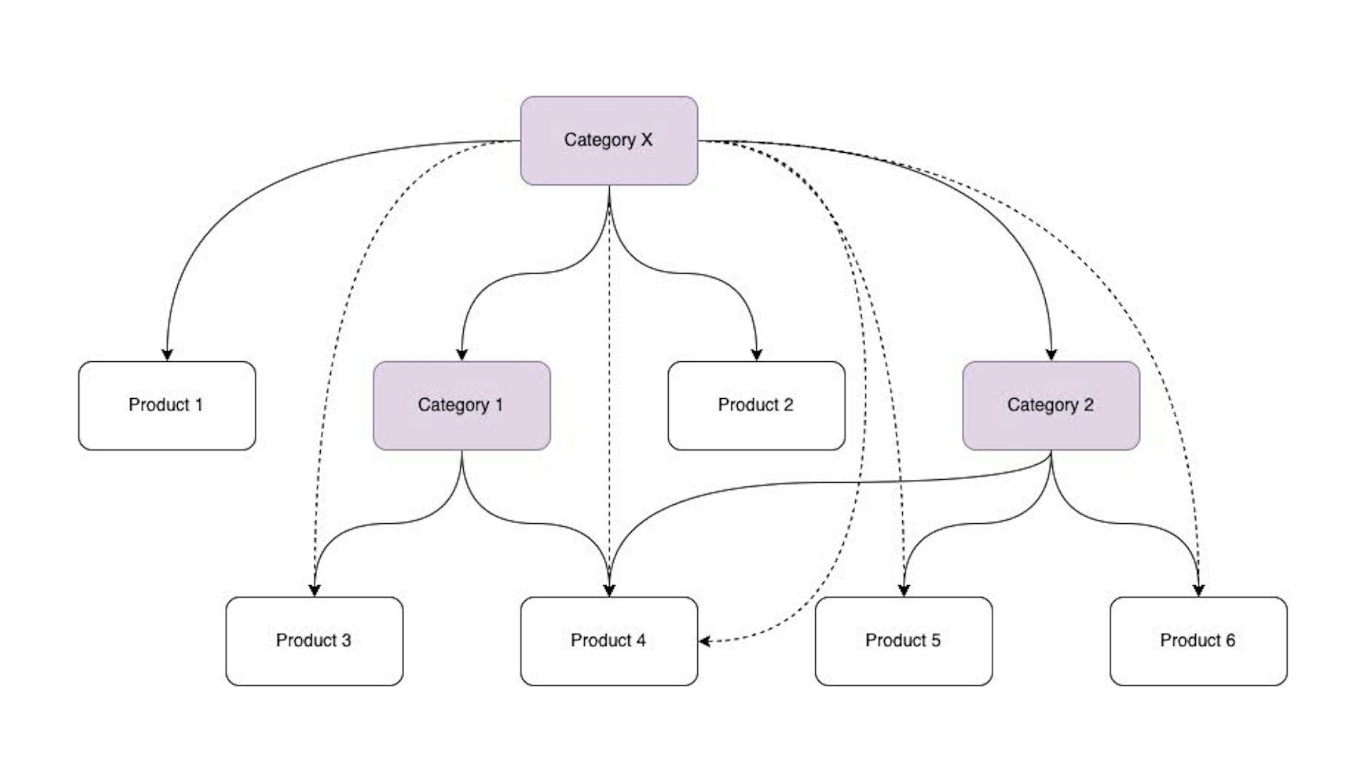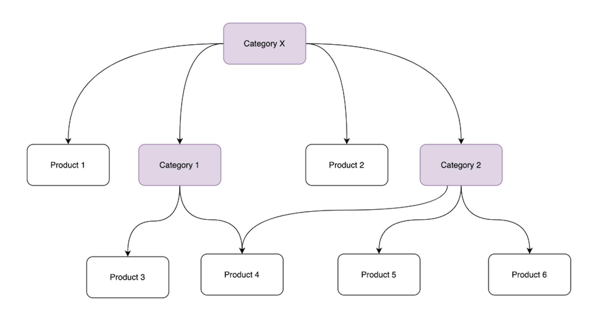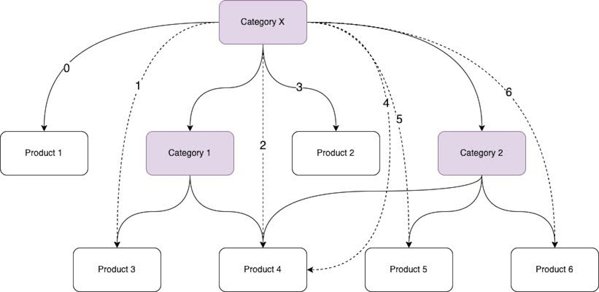 There are two edges connecting Category X to Product 4. This is fine because if Product 4 is removed from Category 1, we shouldn’t lose its indirect inclusion in Category X. To simplify, we can record directly in Product 4 that it belongs to Category X, and it doesn’t matter if it’s included through multiple paths. This kind of edge construction is called